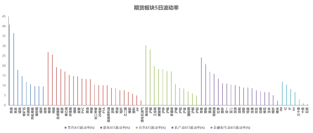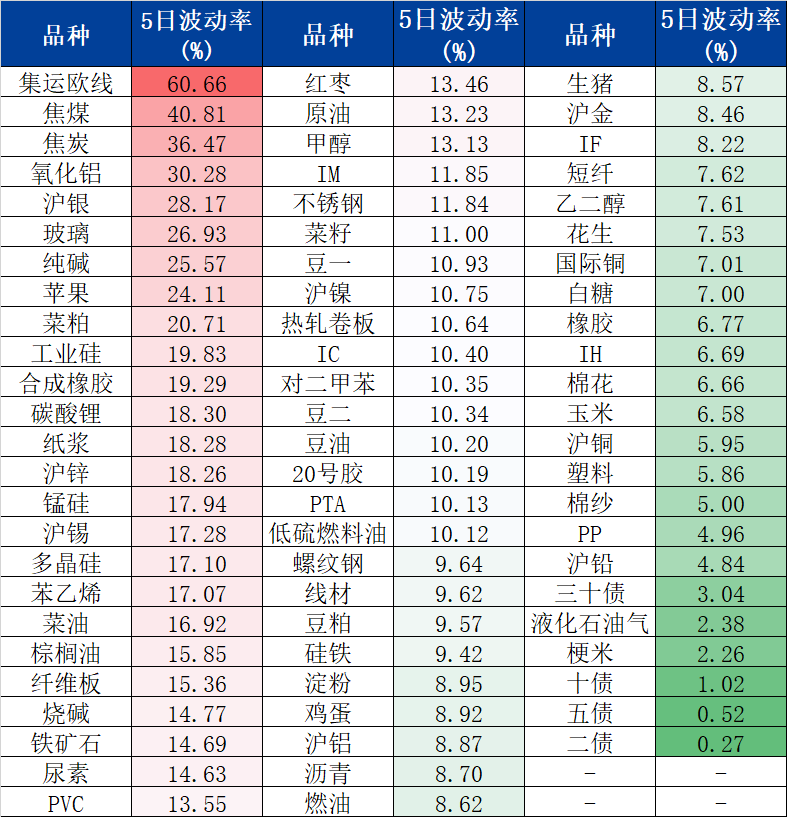 从5日波动率水平看,前三位为集运欧线、焦煤和焦炭;低波动前三品种为二债、五债和十债。