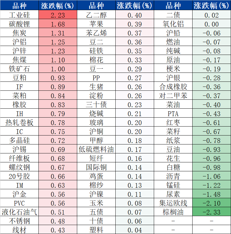 涨幅居前的三个品种分别是工业硅、碳酸锂和焦炭;跌幅居前的是棕榈油、集运欧线和尿素。