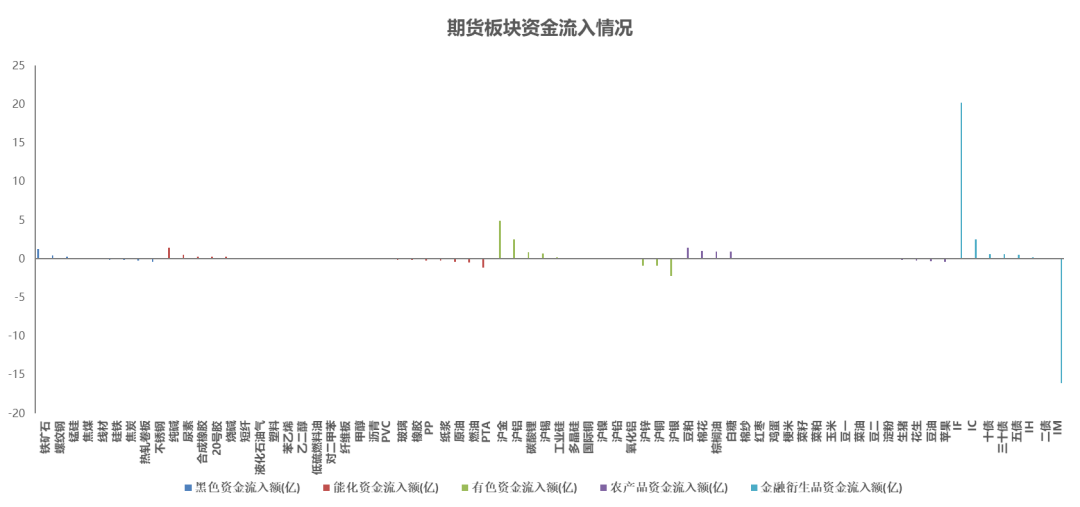 从板块资金流动情况来看,股指、有色多数流入,能化多数流出。