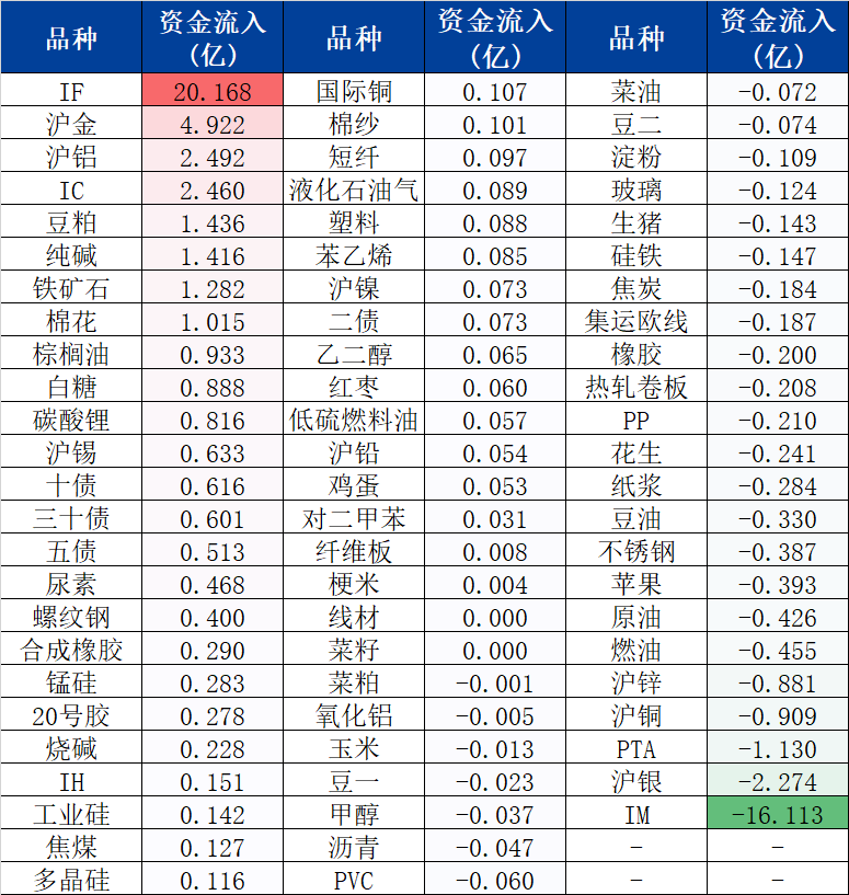 资金流入前三名为IF、沪金和沪铝;流出前三名分别为IM、沪银和PTA。