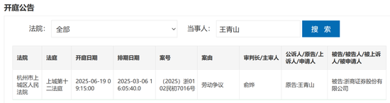 根据浙江法院网披露的开庭公告,王青山因劳动争议起诉浙商证券,该案将于6月19日上午开庭。