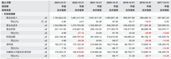 2017年至2023年期间,浙商证券营业收入分别为46.11亿元、36.95亿元、56.59亿元、106.37亿元、164.18亿元、168.14亿元、176.38亿元;归母净利润分别为10.64亿元、7.37亿元、9.68亿元、16.27亿元、21.96亿元、16.54亿元、17.54亿元,总体呈现稳步成长态势。2022年业绩下滑主要是受市场影响,自营投资业务受到拖累。